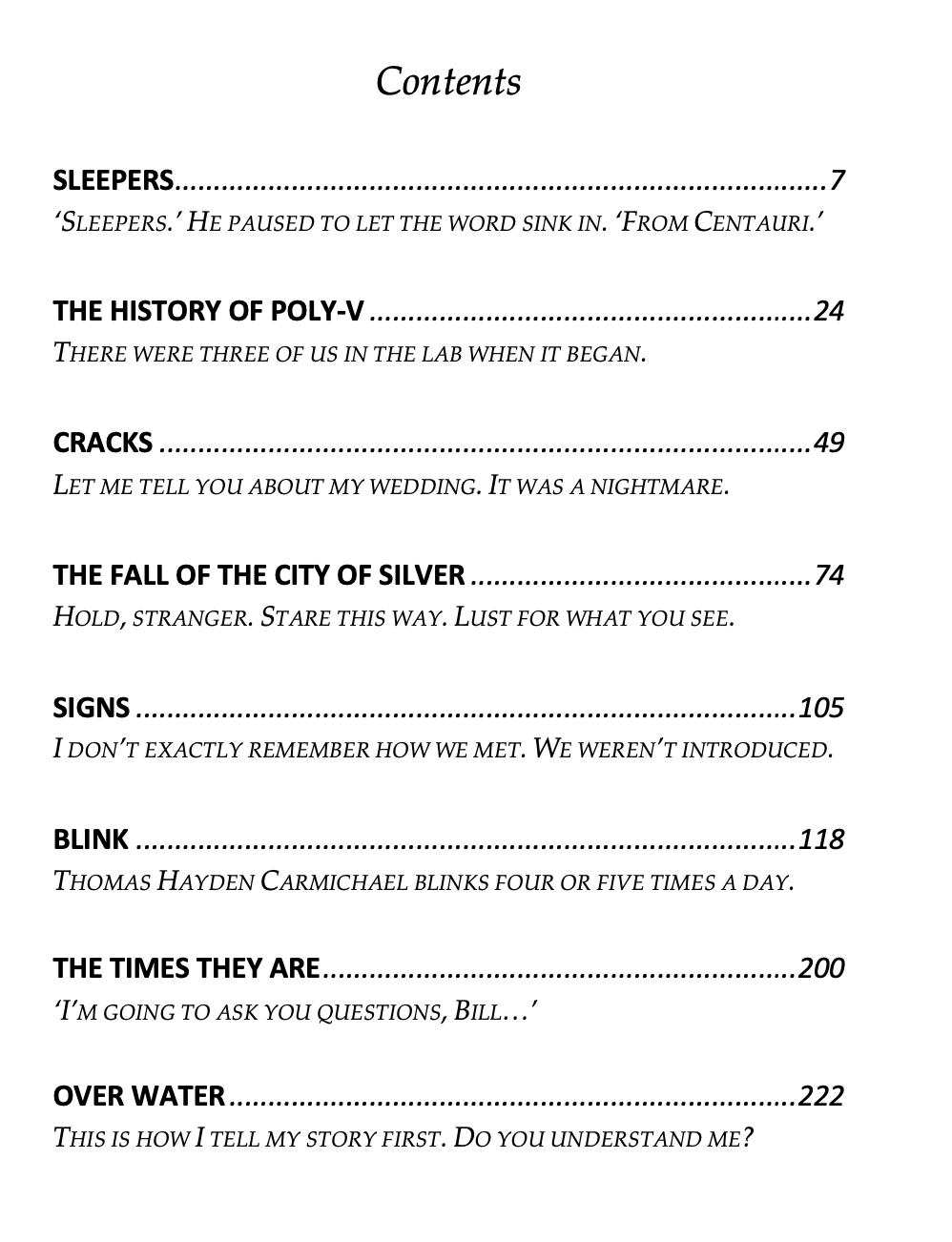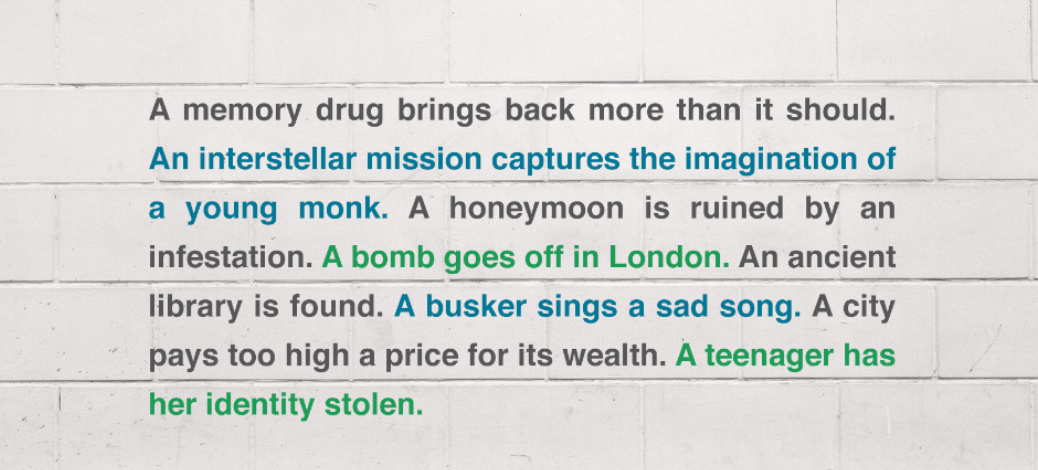 A memory drug brings back more than it should. An interstellar mission captures the imagination of a young monk. A honeymoon is ruined by an infestation. A bomb goes off in London. An ancient library is found. A busker sings a sad song. A city pays too high a price for its wealth. A teenager has her identity stolen.